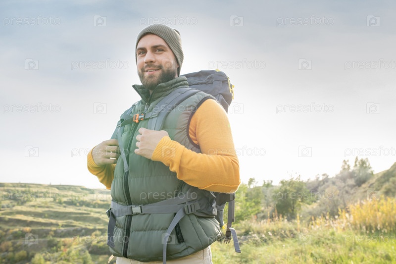 Счастливый молодой бородатый рюкзак в теплых повседневных одеждах, стоящий против гор