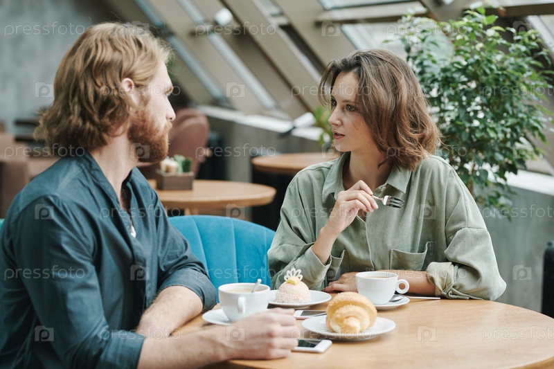 Уверенный молодой человек в обычной рубашке сидит на кресле и отворачивается, разговаривая по телефону в современном кафе