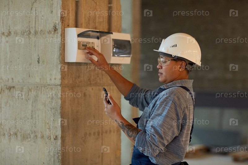 Смешанная раса женщина-электричка, проверяющая коммутатор