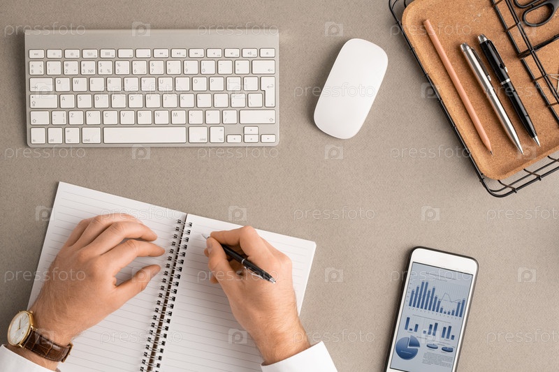 Флатлей рук молодого брокера-мужчины с пером на пустой странице открытой тетради