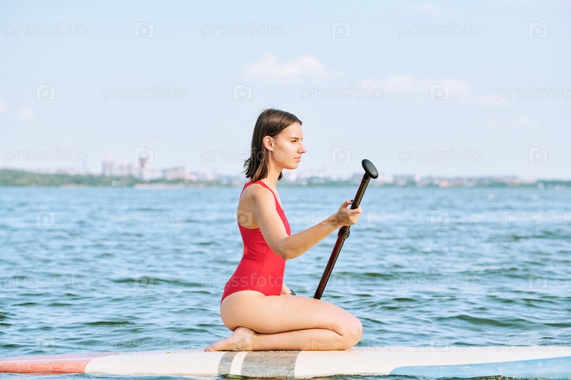 Молодая спокойная спортсменка в красном купальном костюме плавает на воде на летнем курорте