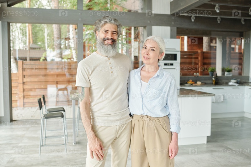 Портрет старшей пары против кухни