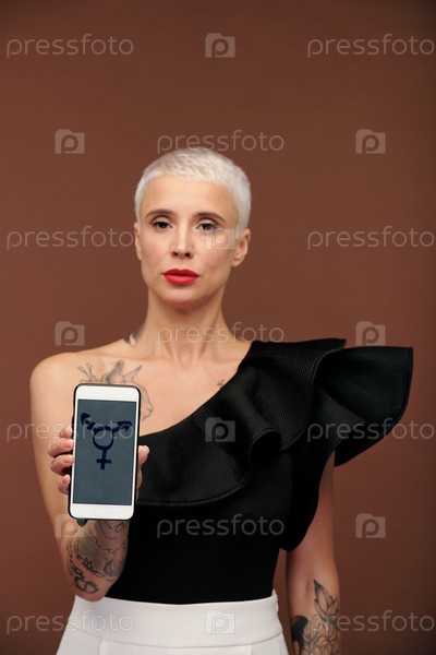 Современная элегантная женщина с татуировками на руках и груди и короткими светлыми волосами