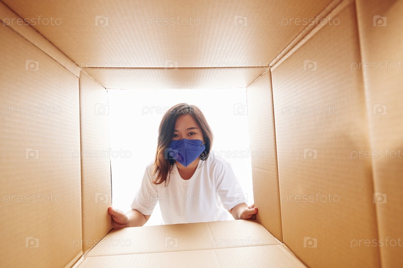Женщина смотрит внутрь картонной коробки