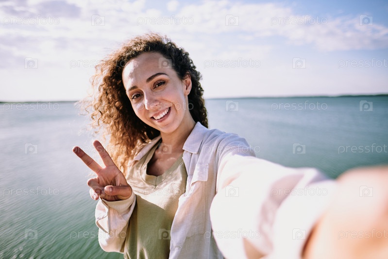 Веселая молодая кудрявая женщина с зубчатой улыбкой, показывающая вам мирный жест