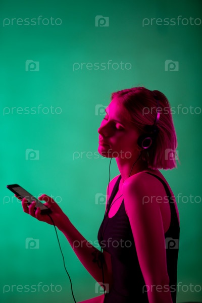 Взволнованная блондинка в наушниках и черном трусе наслаждается своей любимой музыкой