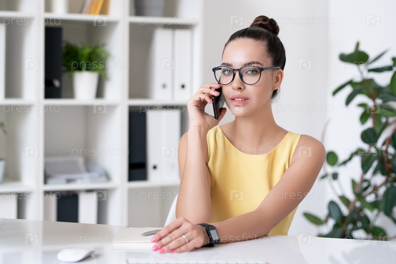 Красивая молодая бизнес-леди в очках и желтом платье использует смартфон