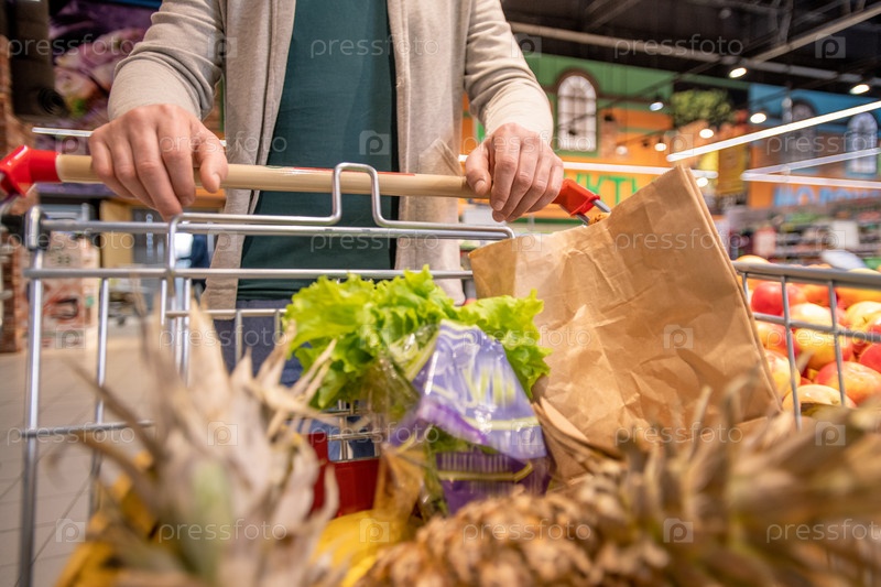 Руки современного зрелого клиента, толкающего тележку с свежими фруктами и овощами