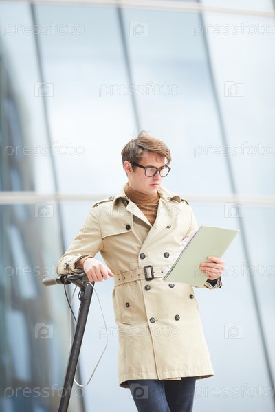 Бизнесмен, читающий документы на открытом воздухе