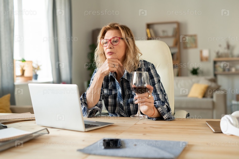 Зрелая блондинка в квадратной рубашке, выпивающая бокал вина перед ноутбуком