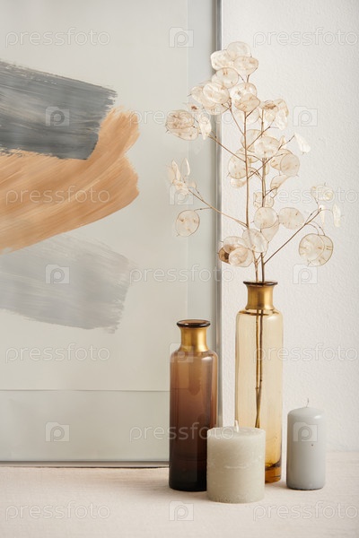Современный натюрморт композиции снимок лунных цветов, стеклянные сосуды и абстрактная живопись на белом фоне