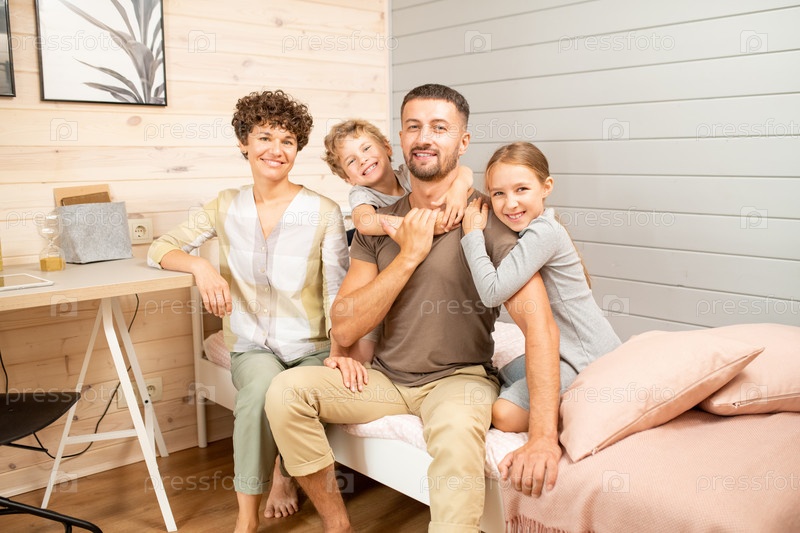 Счастливая молодая семья из четырех человек в повседневной одежде, сидящая на кровати перед камерой