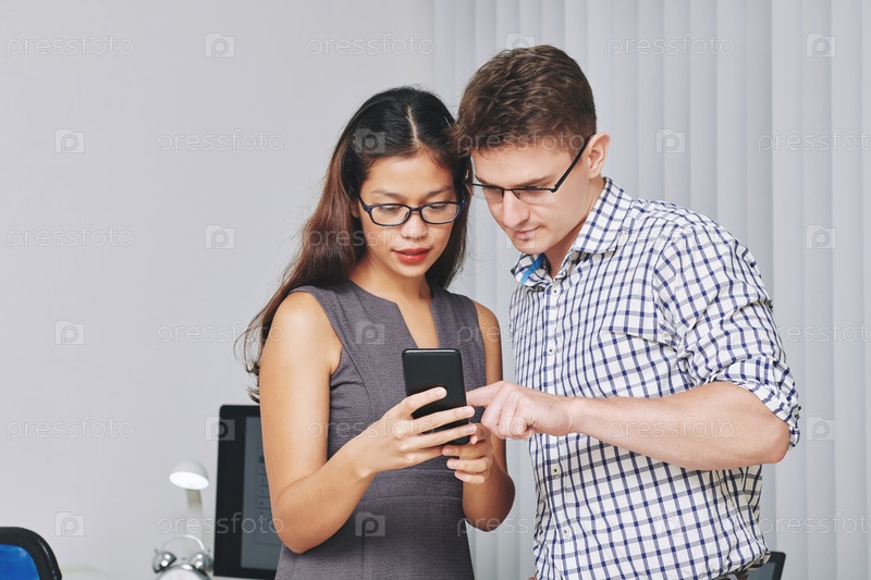 Бизнесмены обсуждают новое мобильное приложение