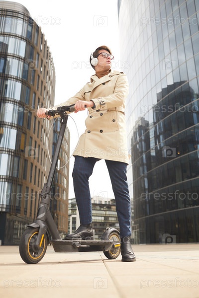 Современный бизнесмен едет на скутере в городе