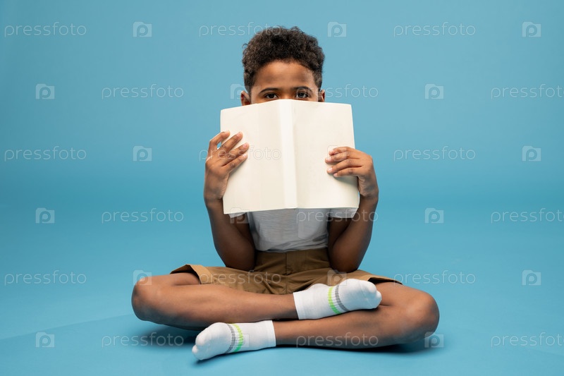 Милый маленький школьник африканской этнической принадлежности, держащий открытую книгу рядом с лицом