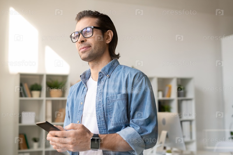 Молодой уверенный бизнесмен в очках и повседневной одежде с помощью смартфона