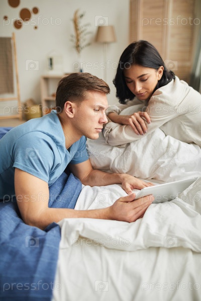Пара, использующая онлайн-сервисы в спальне