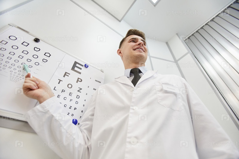 Офтальмолог, указывающий на глазную диаграмму Низкий угол