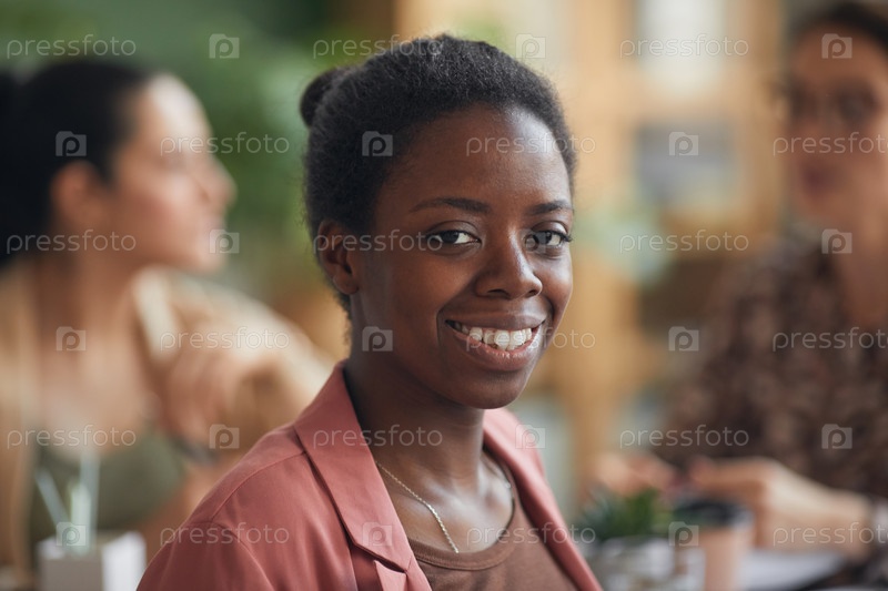 Афроамериканская бизнесвумен улыбается на камеру во время встречи