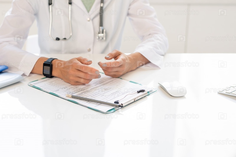 Руки молодого клинициста в белом халате, сидящего за столом и консультирующего кого-то