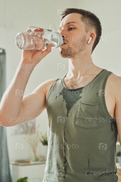 Молодой потный спортсмен в наушниках и спортивной одежде пьет воду из бутылки