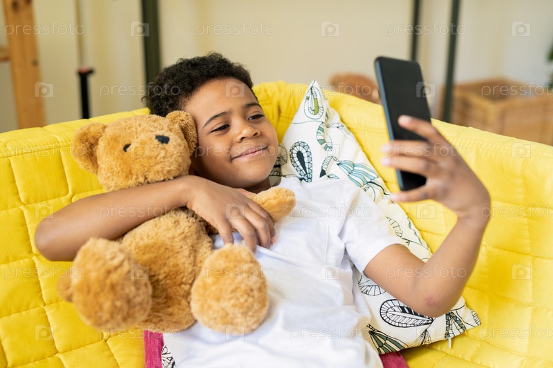 Милый мальчик африканской этнической принадлежности обнимает своего плюшевого медведя, делая селфи