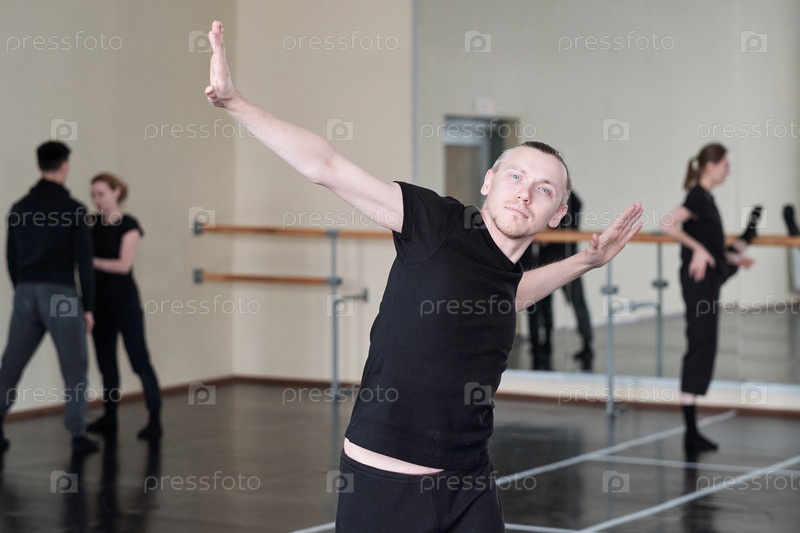 Молодой здоровый блондин в черной спортивной одежде делает одно из танцевальных упражнений
