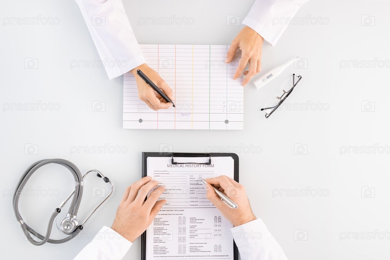Обзор рук врача-мужчины, заполняющего форму медицинской истории в клавиатуре