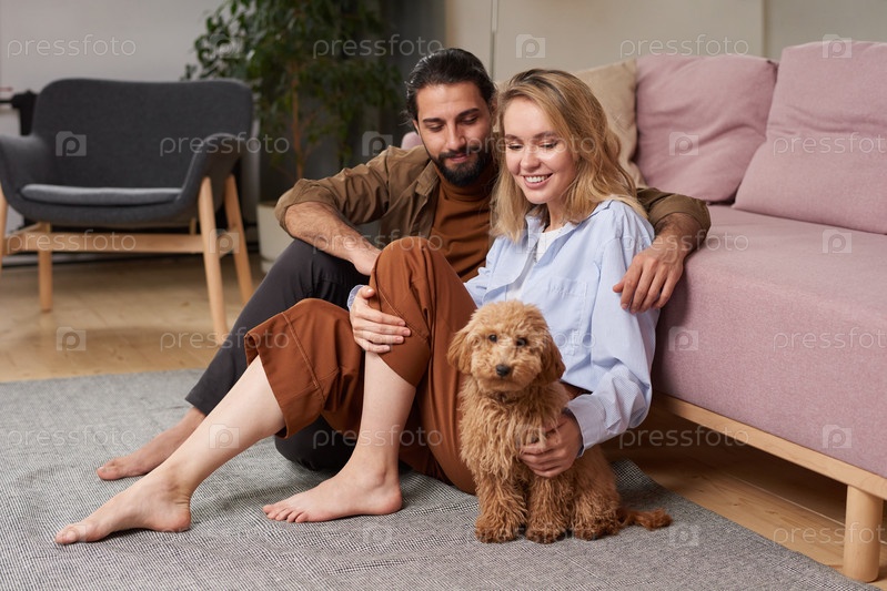 Современный молодой человек и влюбленная женщина проводят время вместе дома, сидя на полу в гостиной, отдыхая со своей милой собакой