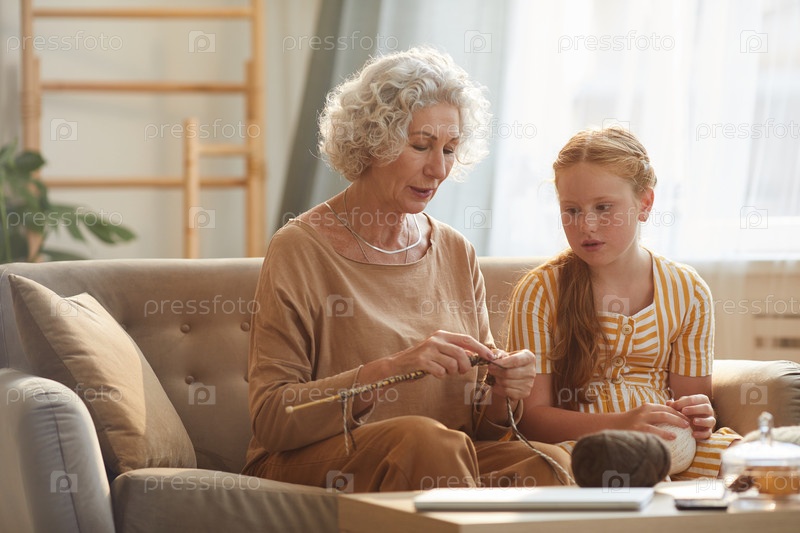 Бабушка учит девочку вязать