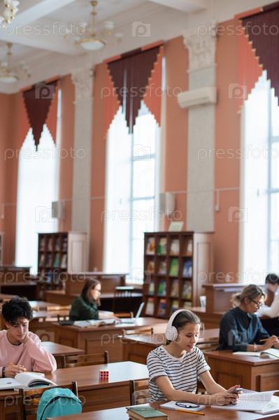 Студент-подросток прокручивает свой смартфон по столу в библиотеке колледжа