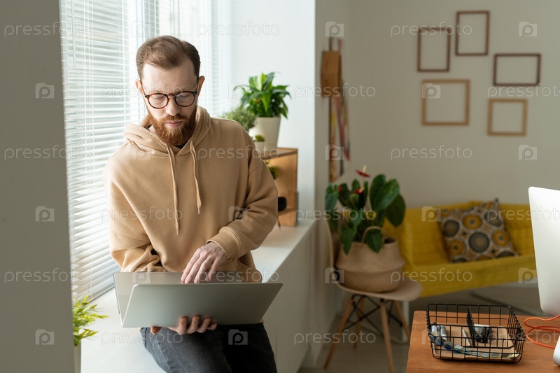 Молодой бородатый фрилансер смотрит на данные на дисплее, сидя у окна