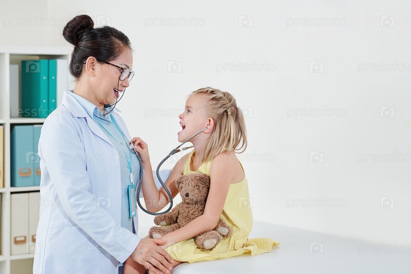 Врач позволяет девушке играть со стетоскопом