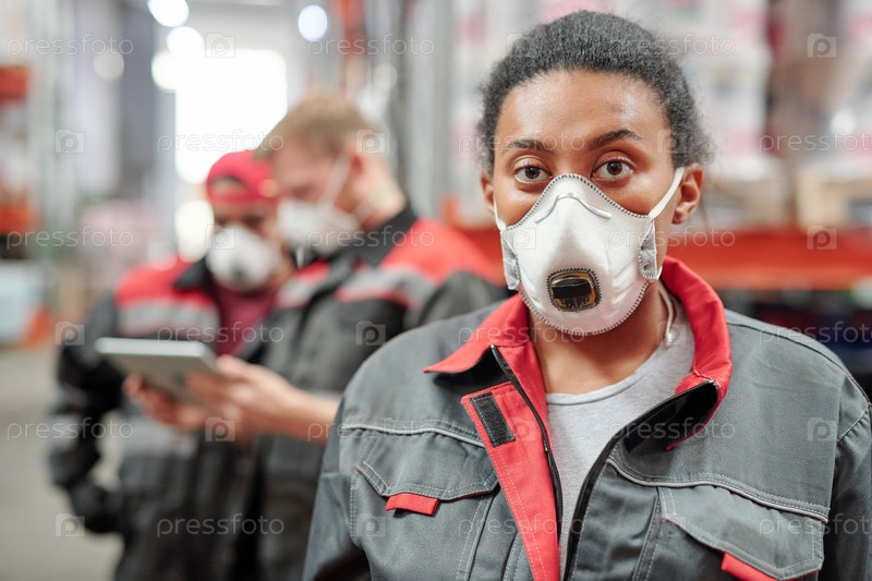 Молодая смешанная женщина-работница в униформе и защитном респираторе