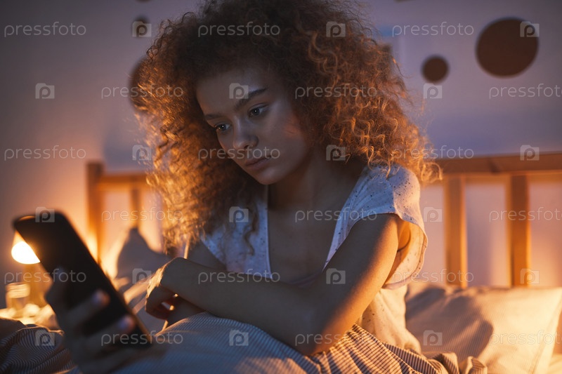Девушка, использующая смартфон в постели ночью