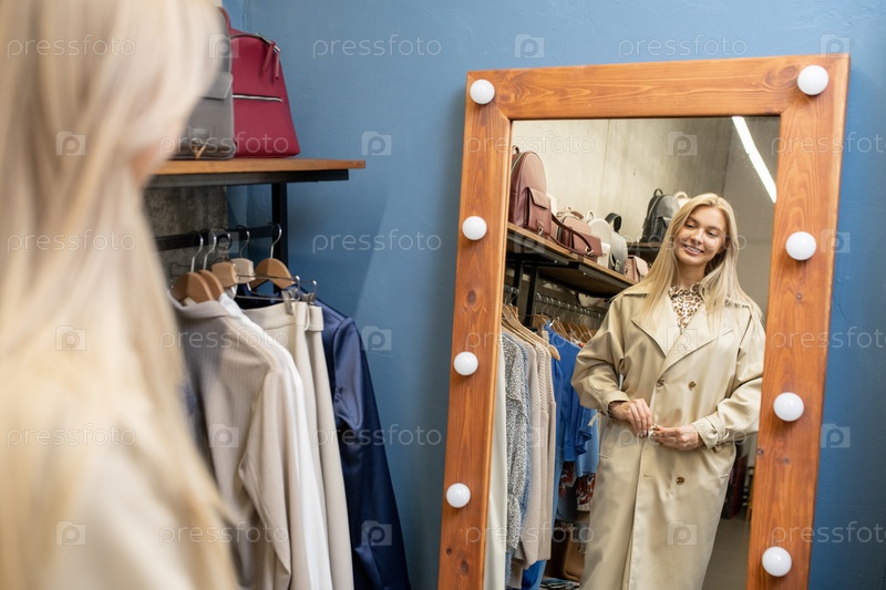Счастливая молодая блондинка пытается надеть новое элегантное бежевое пальто перед зеркалом