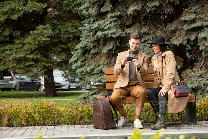 Счастливый молодой человек в стильной теплой одежде и его девушка отдыхают на скамейке в парке