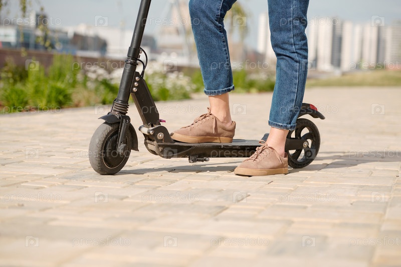 Ноги молодой современной женщины в джинсах и сапогах, стоящей на подставке скутера