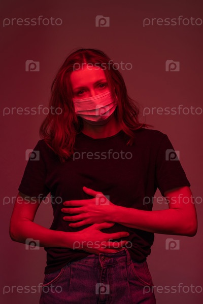 Больная молодая женщина в защитной маске, касающаяся ее желудка во время болезни