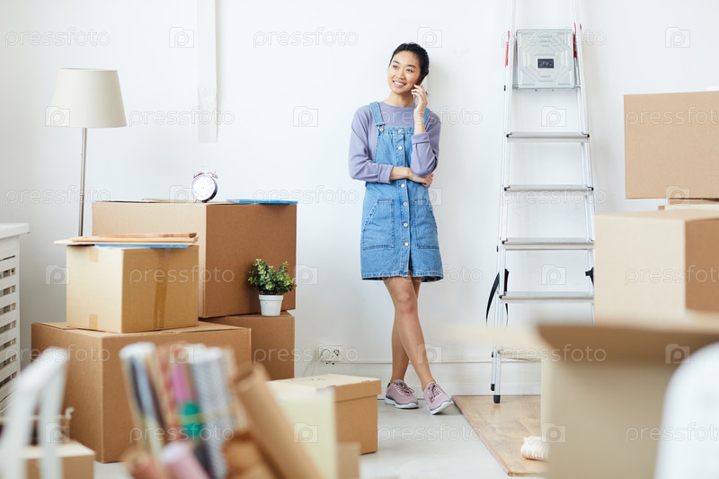Молодая азиатская женщина распаковывает коробки в новом доме
