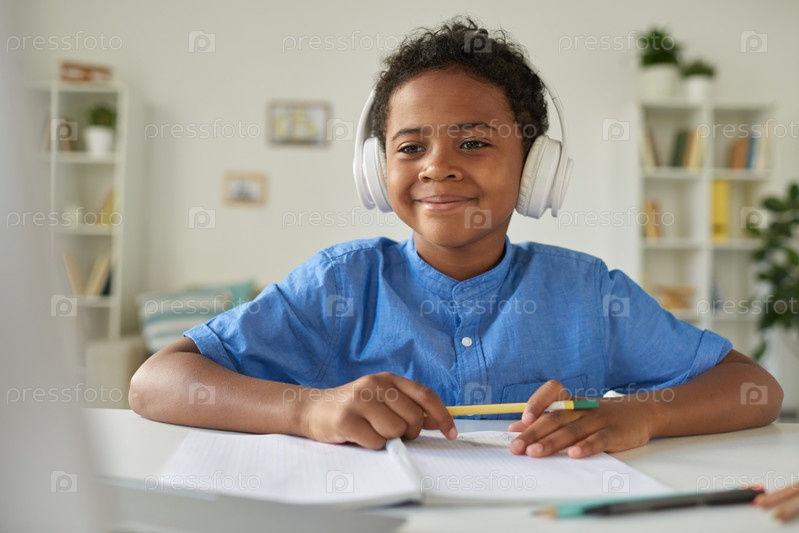 Улыбающийся любопытный чернокожий мальчик в беспроводных наушниках сидит за столом в гостиной и наслаждается онлайн-уроком с репетитором