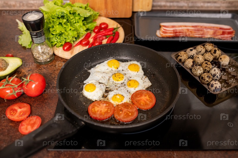 Несколько жаренных перепелиных яиц и кусочков помидоров, посыпанные измельченным черным перцем