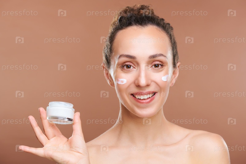Молодая красивая женщина держит маленькую банку с увлажняющим и омолаживающим кремом