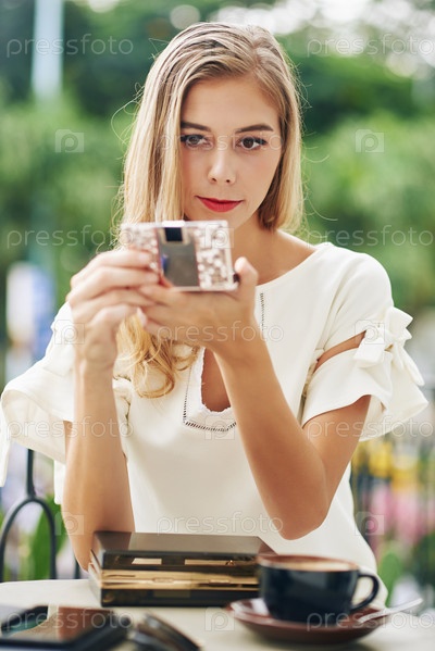 Молодая женщина проверяет макияж