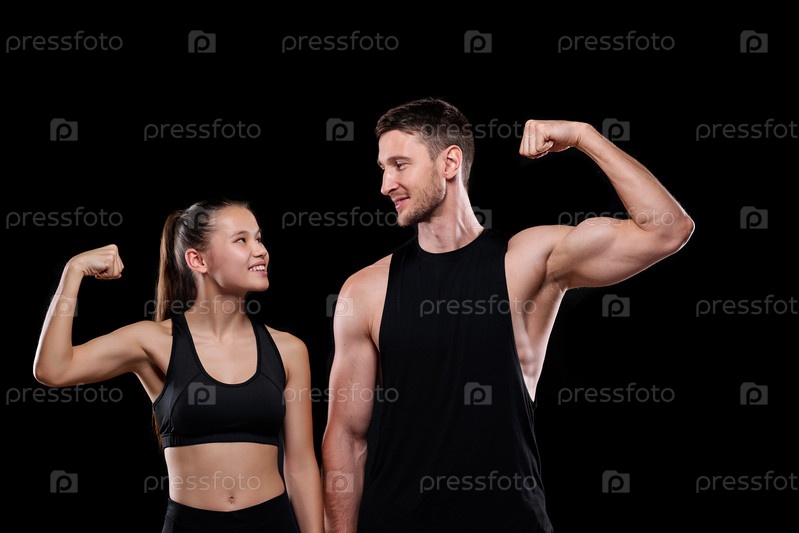 Молодая веселая спортивная пара в активной одежде смотрит друг на друга