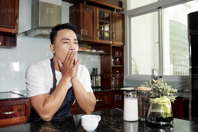 Человек, который зевает на кухонной стойке