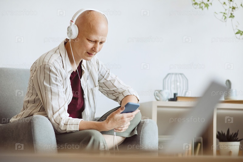 Современная лысая женщина слушает музыку дома