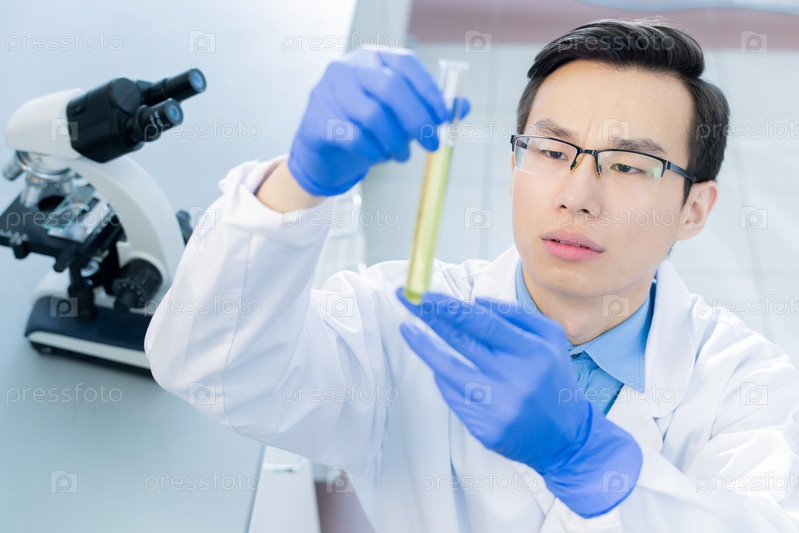 Молодой серьезный китайский ученый смотрит на колбу с жидкой химической субстанцией