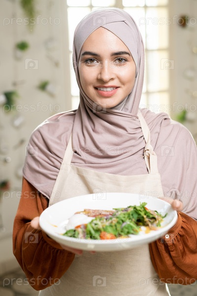 Молодая улыбающаяся мусульманка в хиджабе держит тарелку с самодельным салатом и мясом