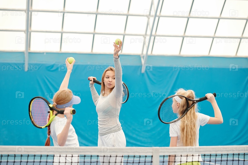 Молодой тренер по теннису держит ракетку за шеей и поднимает руку с мячом